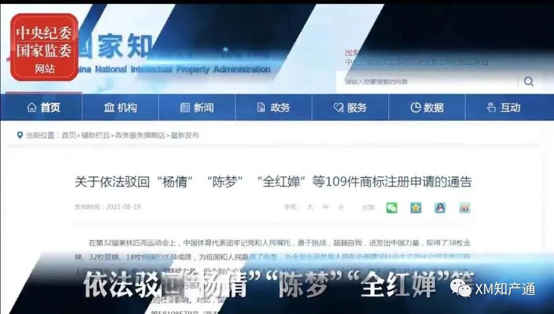 2021年8月19日,国家知识产权局发布通告,依法驳回“杨倩”、“全红婵”、“陈梦”等109件商标注册申请。通报指出,个别企业和自然人恶意抢注,以攫取或不正当利用他人市场声誉,侵害他人姓名权及其合法权益,已产生了恶劣的社会影响。对此,国家知识产权局予以谴责,并依据商标法第十条第一款第(八)项的规定,对第58130606号“杨倩”、第58108579号“陈梦”、第58265645号“全红婵”等109件商标注册申请(含一标多类)予以快速驳回。