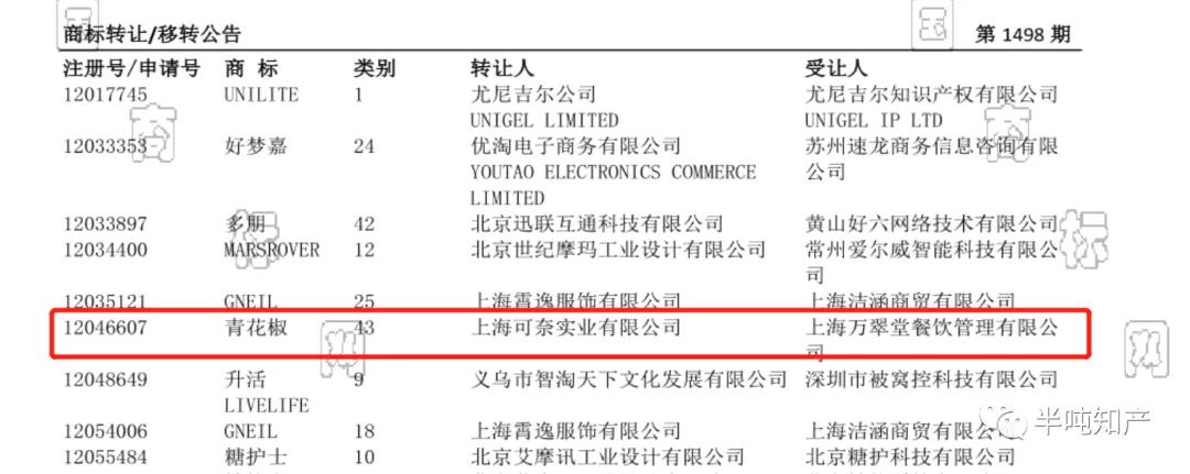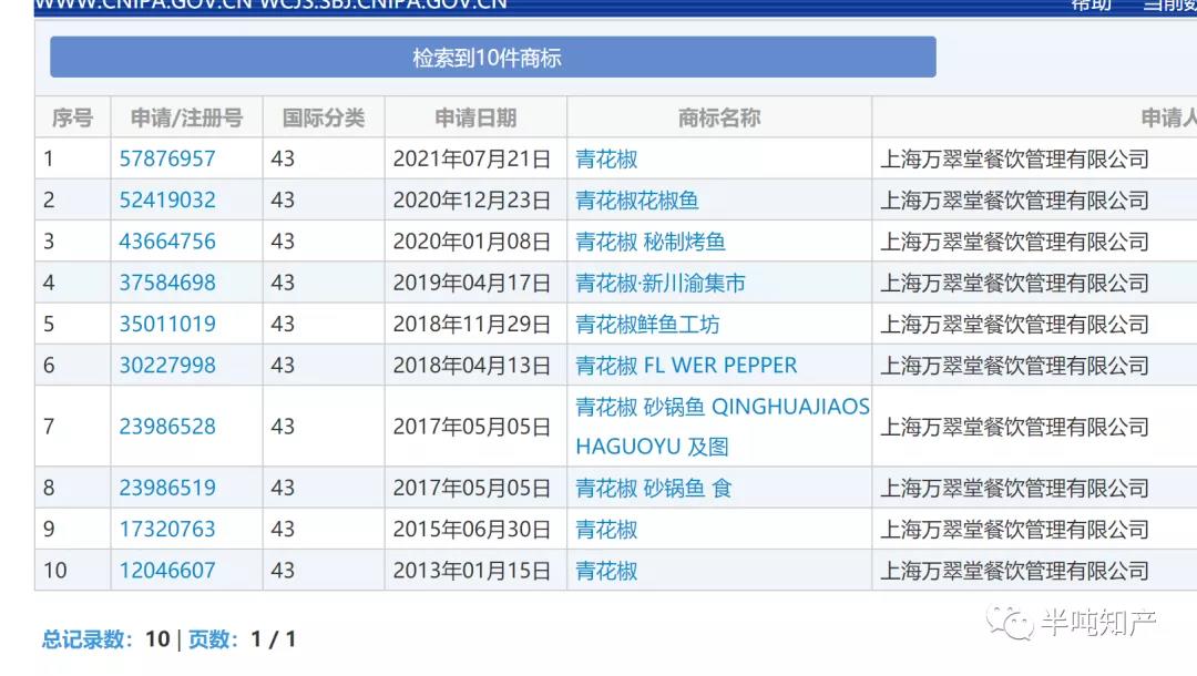 带着这个问题,进入今天的分享,首先,看下商标持有人上海万翠堂餐饮管理有限公司(以下简称“上海万翠堂),在第43类餐饮服务上,一共拥有10件“青花椒”商标,其中,最早的一件与2013年1月15日由上海可奈实业有限公司申请,后在2016年4月6日转让给上海万翠堂,上海万翠堂又分别在2015年、2017年、2018年、2019年、2020年、2021年分别补充注册带“青花椒”的商标。